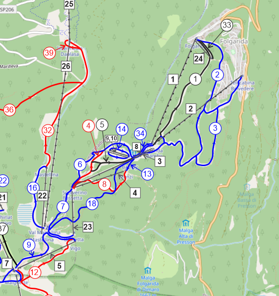 Poniżej Malghet Aut prowadzą długie trasy 1 Nera Folgarida , 2 Azzura i 3 Belvedere ; z drugiej strony znajduje się szczyt Monte Spolverino, z którego prowadzą pozostałe trasy Foilgaridy.